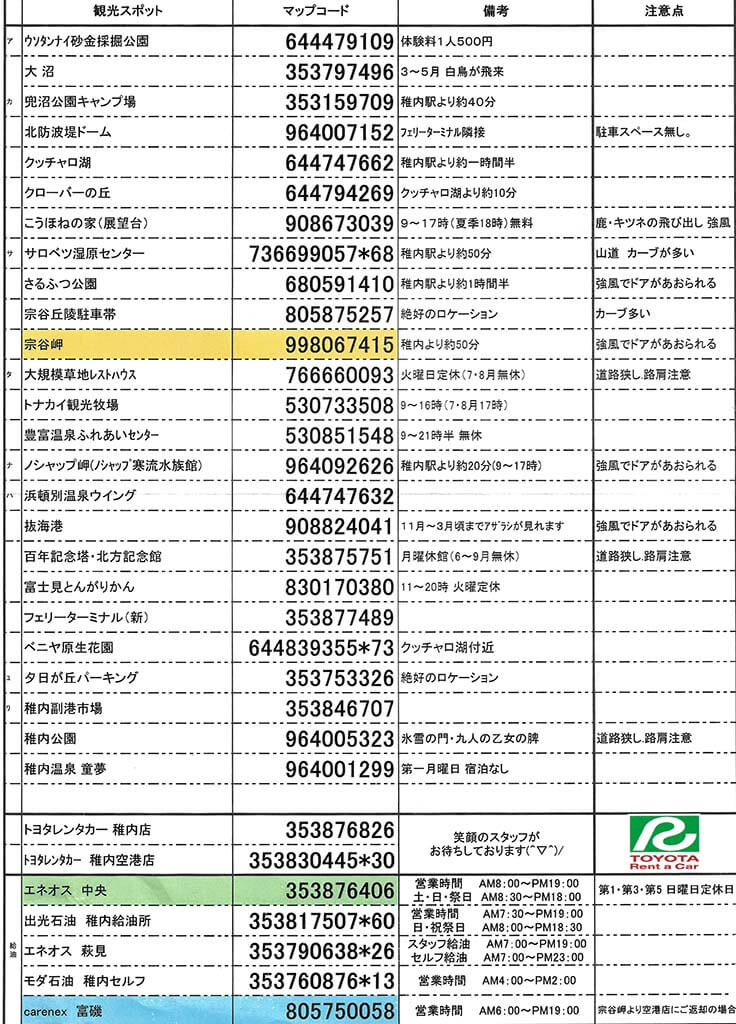 ↑Toyota租車提供一常完整的日文稚內景點的MapCode表(大圖按此)